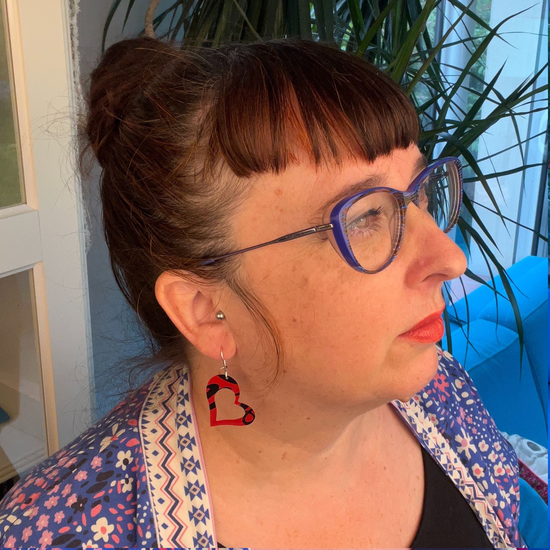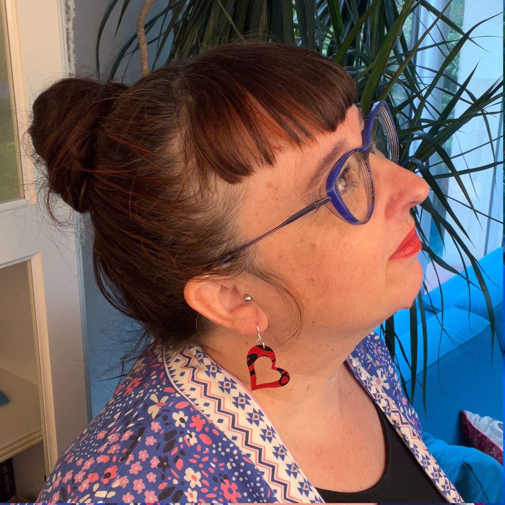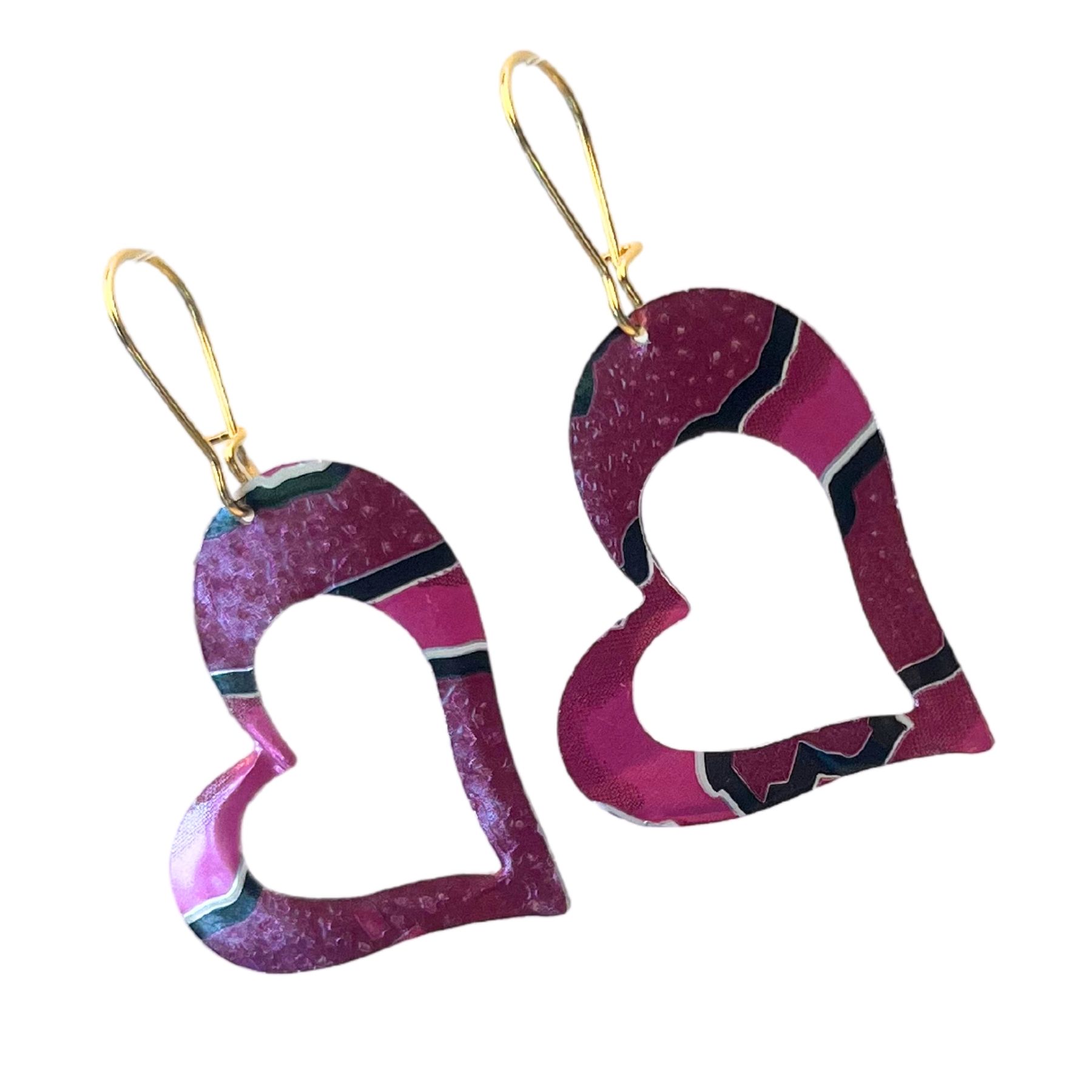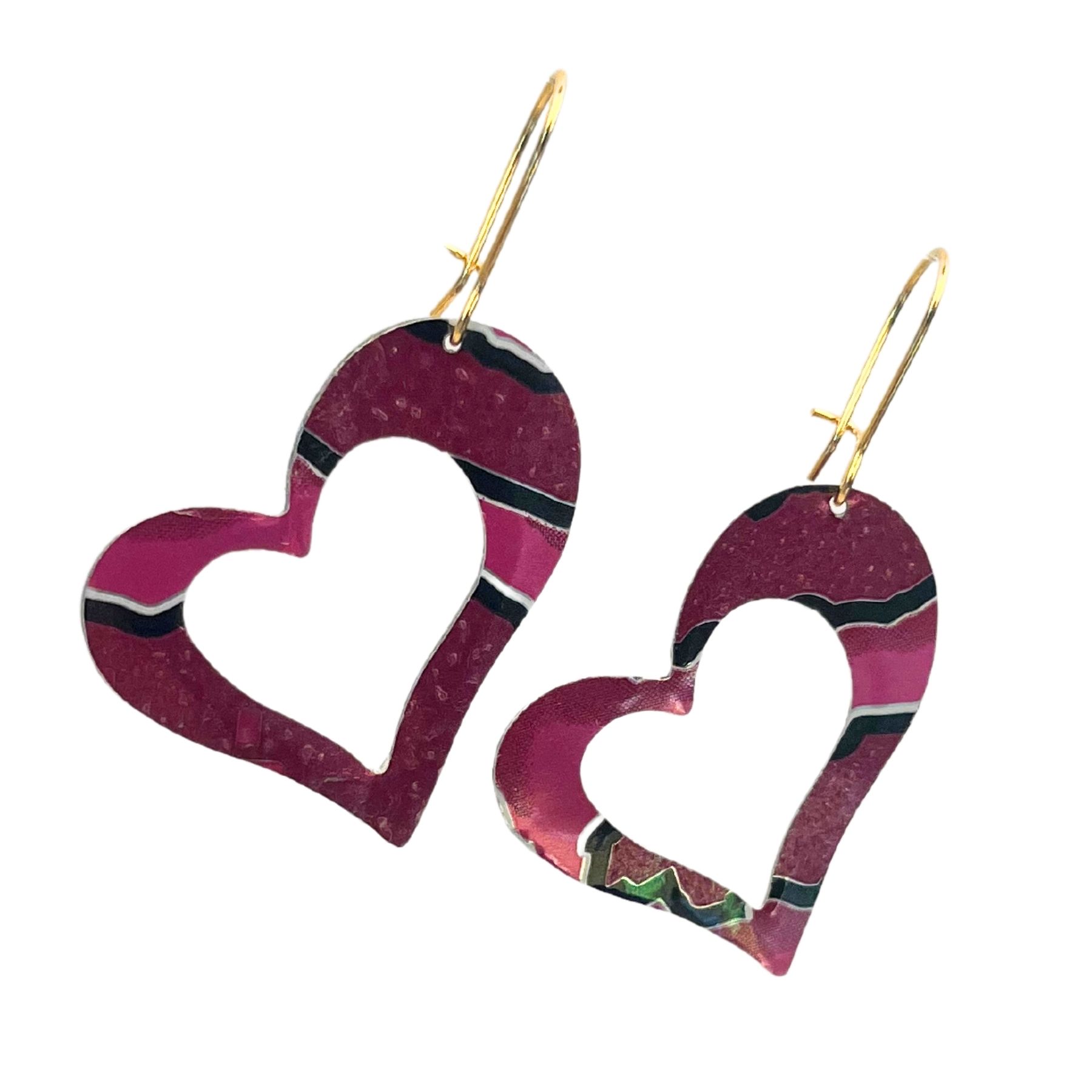Boucles d’oreilles en canette upcyclée écoresponsable version coeur issues d’une canette de Monster.