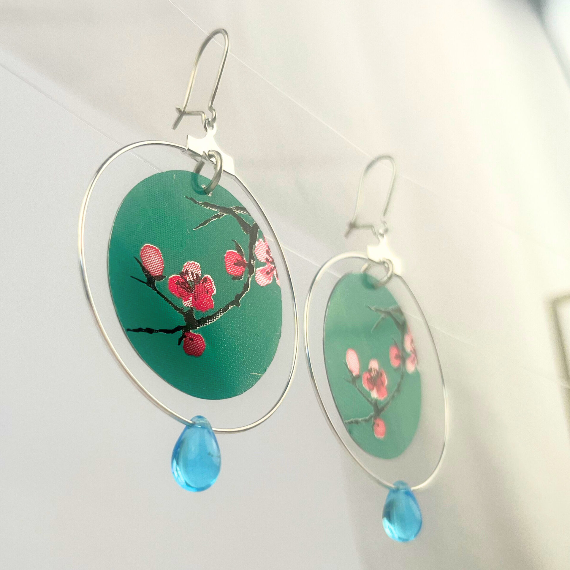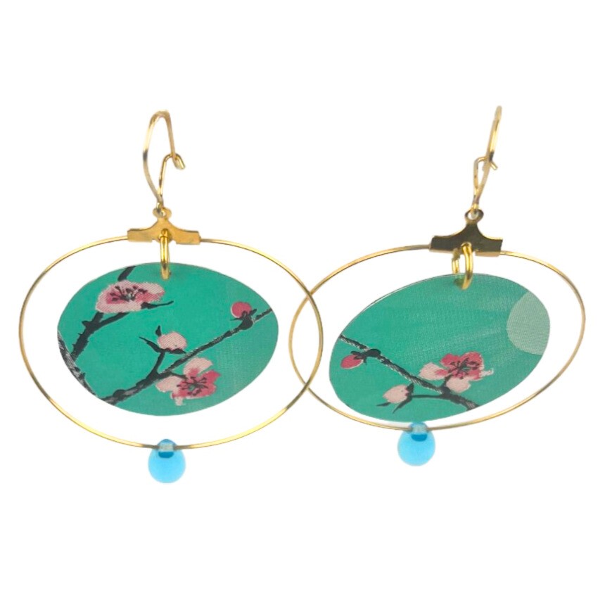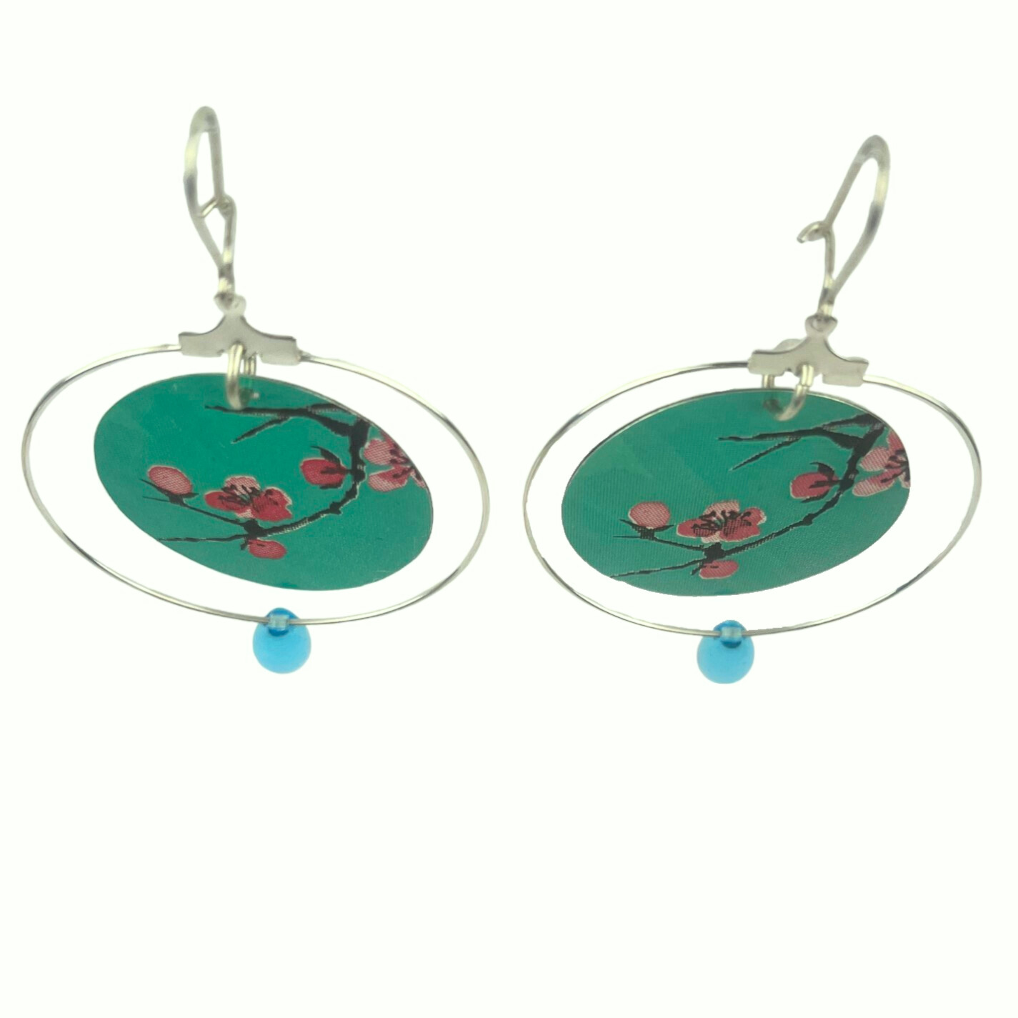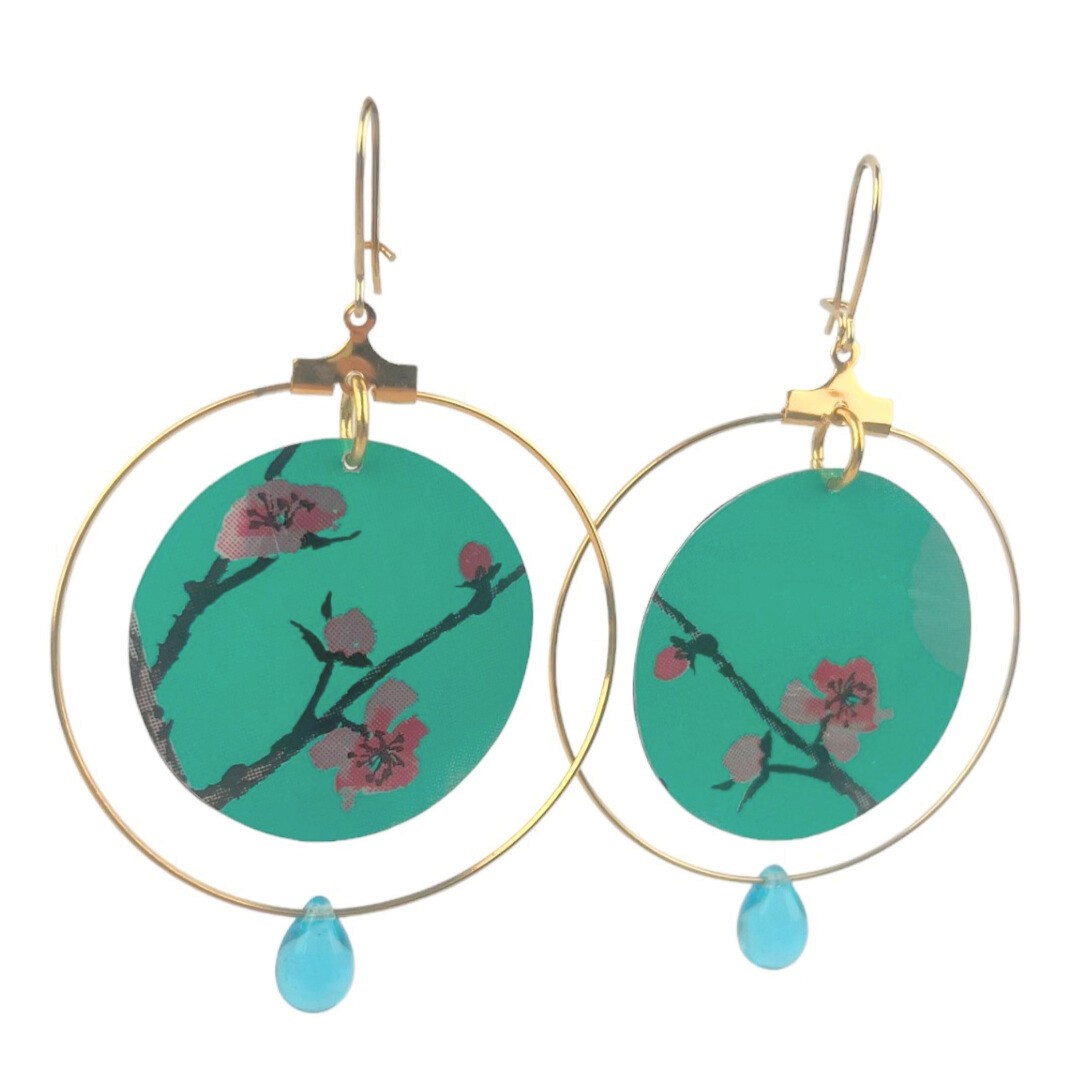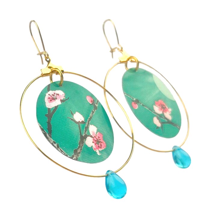 Boucles d’oreilles en canette upcyclée écoresponsable motif Fleur de cerisier version créole.