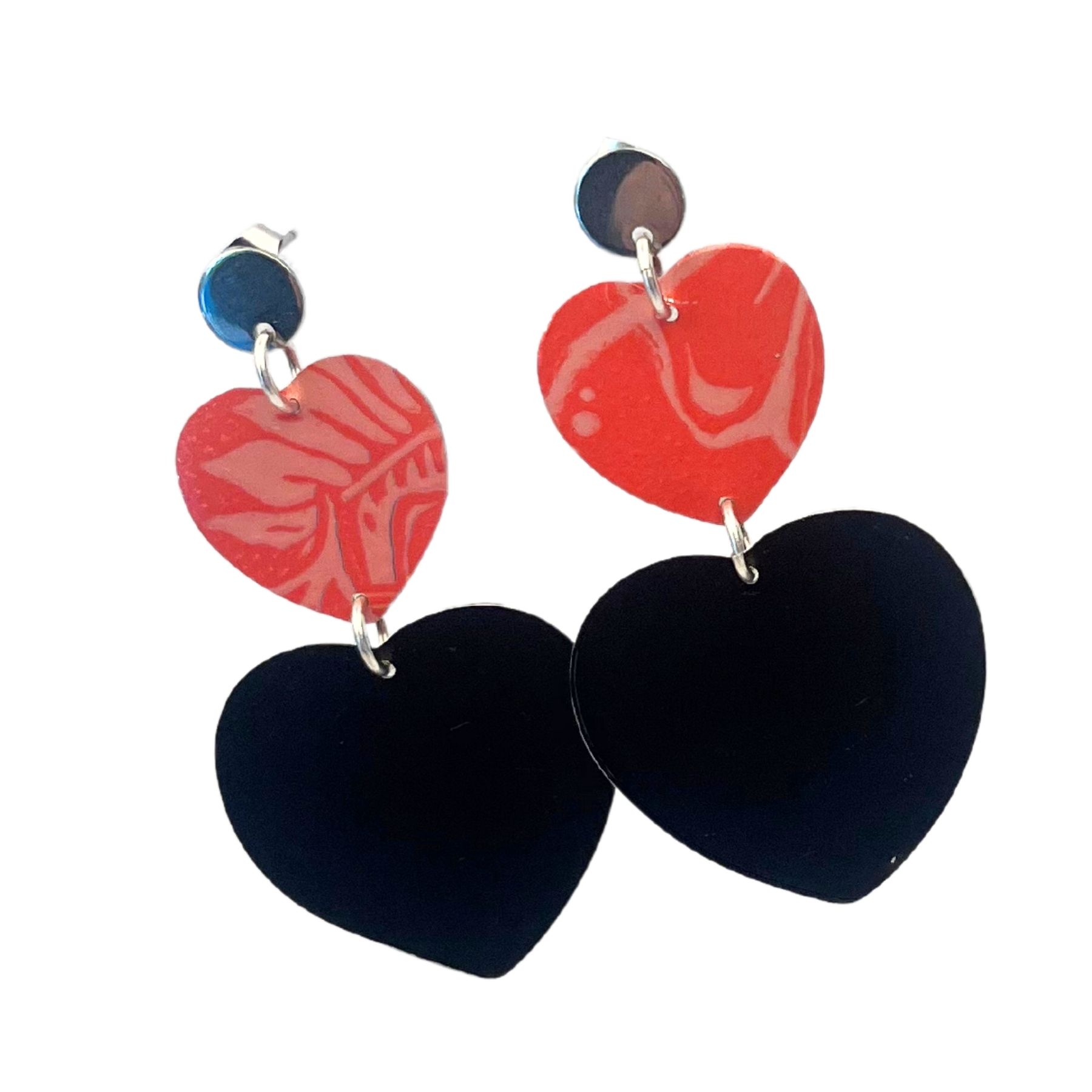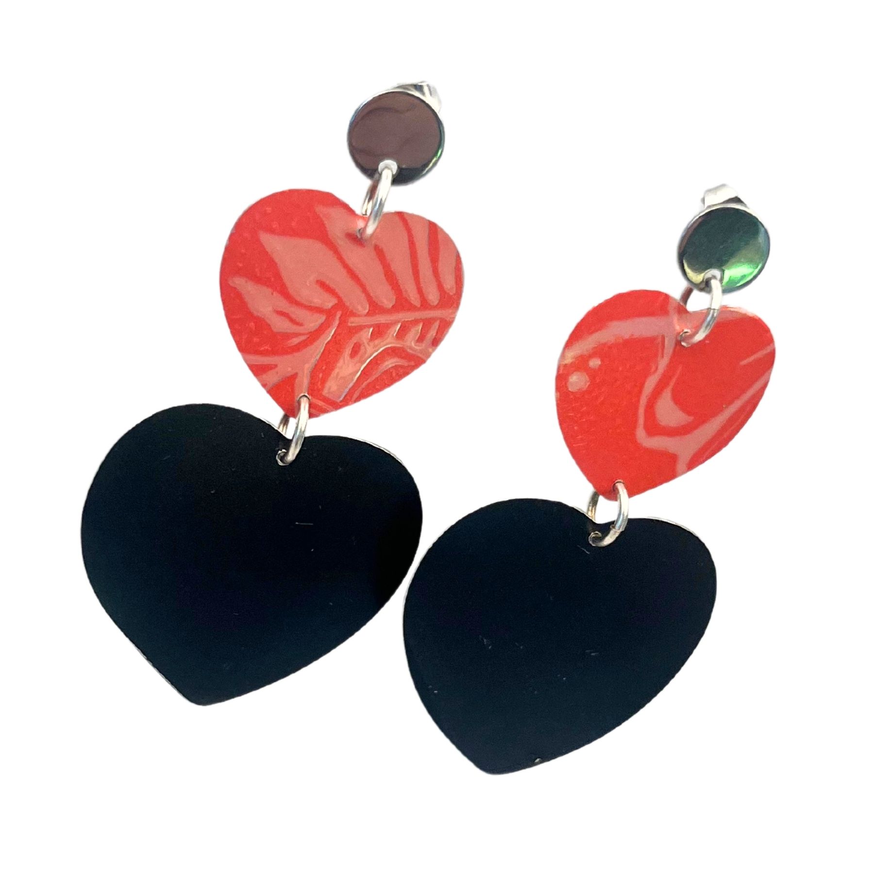 Boucles d’oreilles en canette upcyclée écoresponsable noir et rose version double coeur issues de deux canettes de Monster.