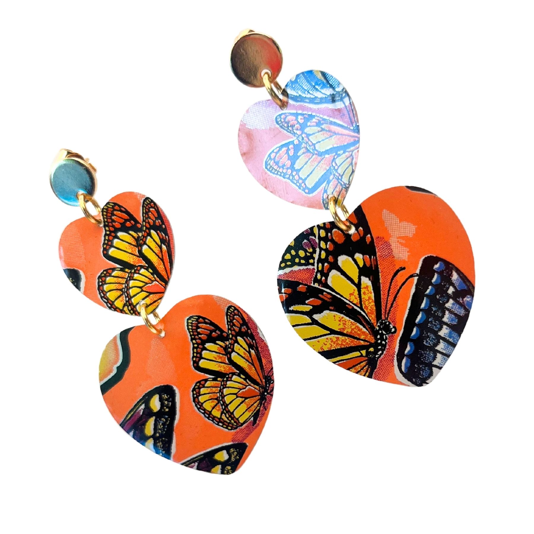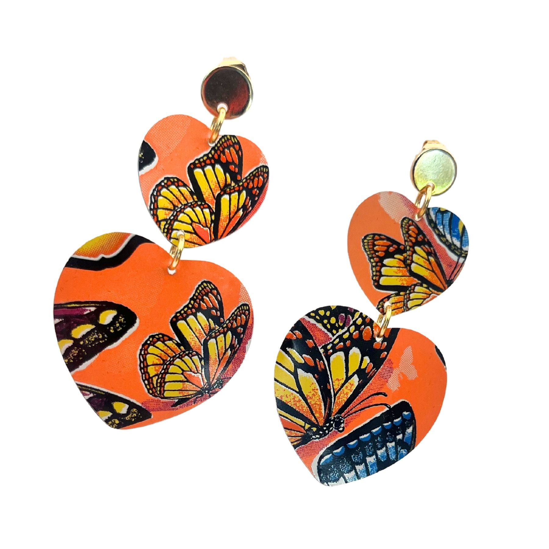 Boucles oreilles double coeur papillon jaune en canette upcyclée écoresponsable issues d’une canette de Monster.
