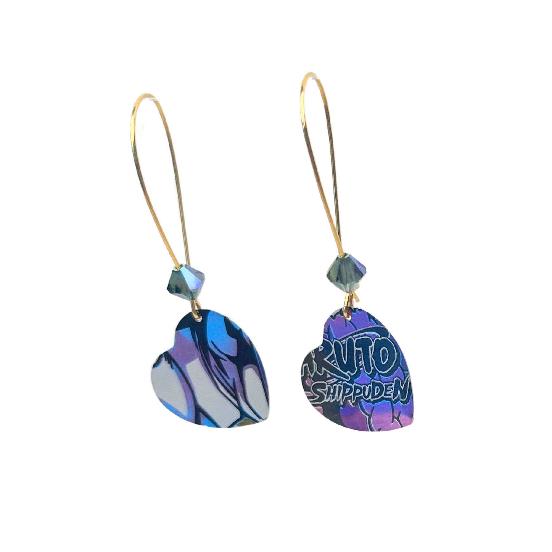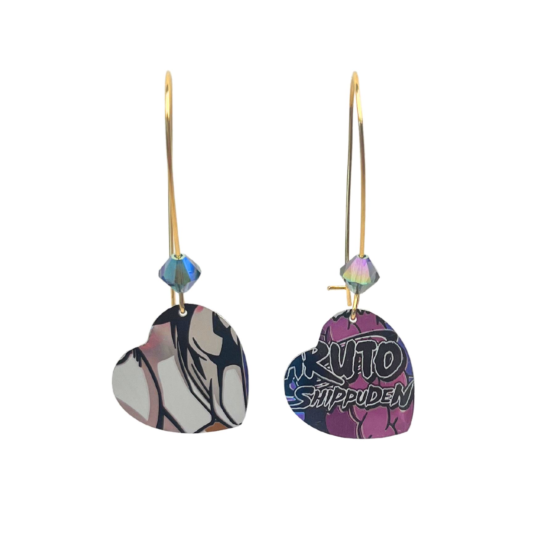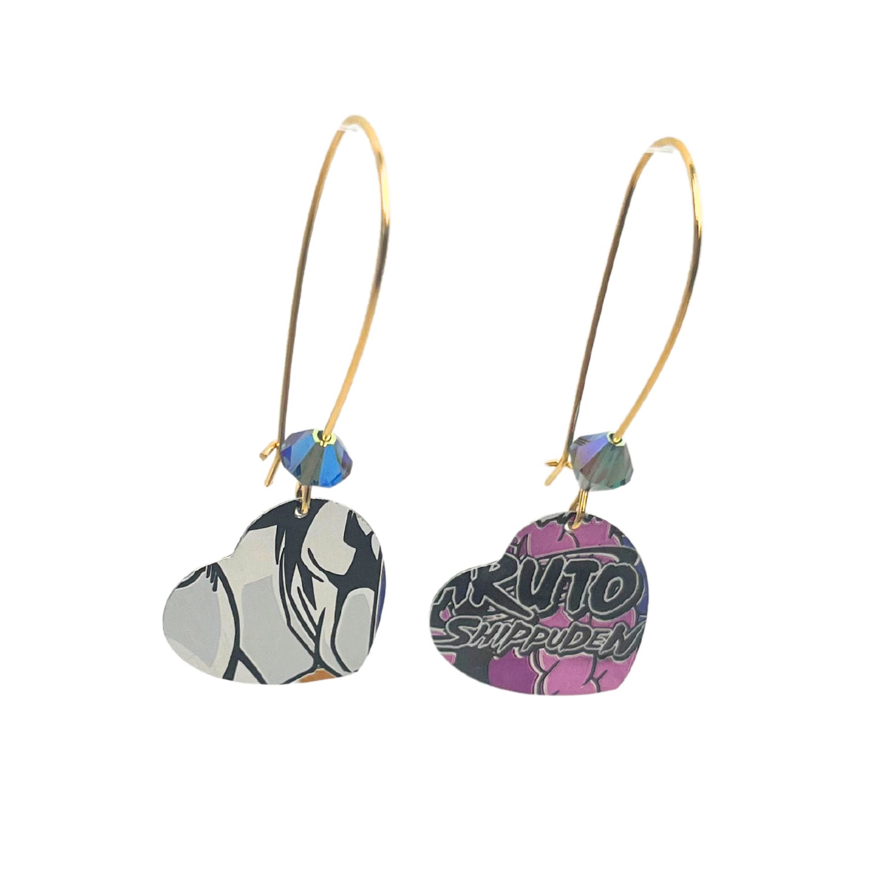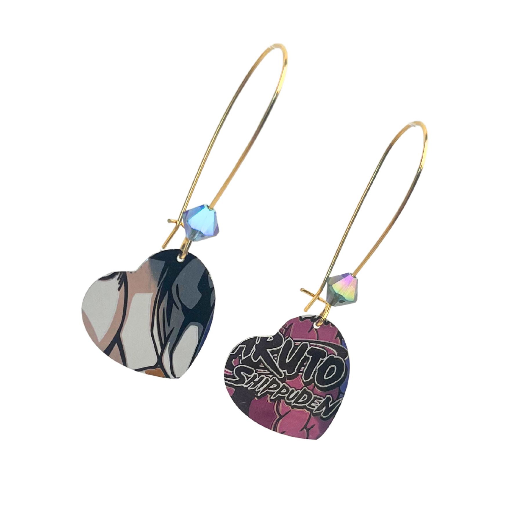 Boucles d’oreilles coeur manga upcyclée écoresponsable coeur Naruto issue d’une canette de la marque Ultra Pop version pendantes.
