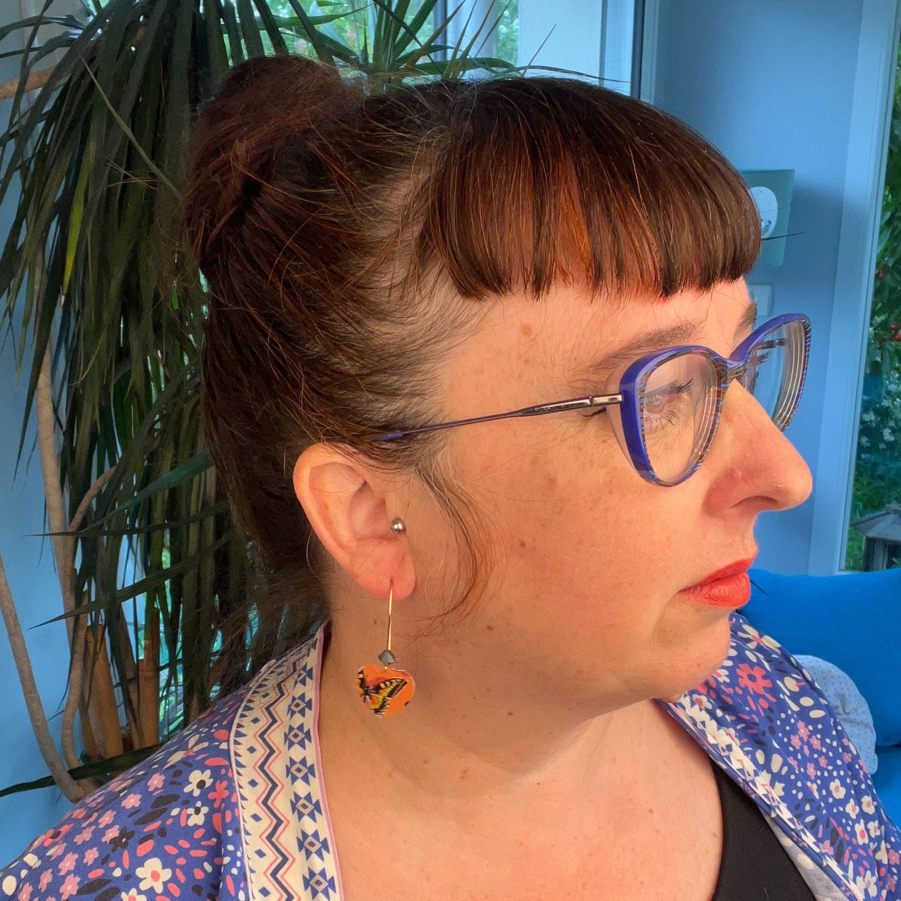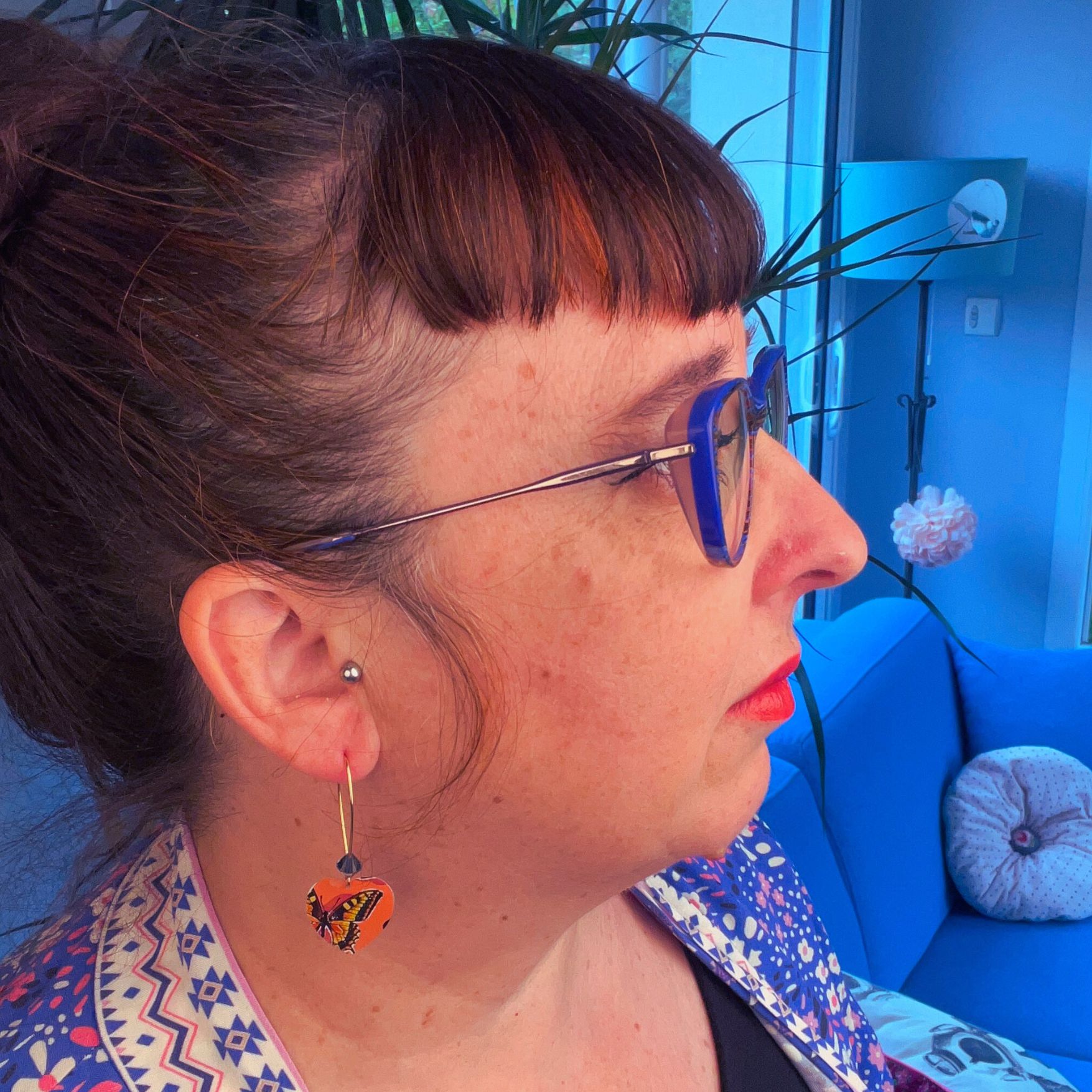 Boucles d’oreilles coeur papillon en canette upcyclée écoresponsable issue d’une canette de monster version pendantes.