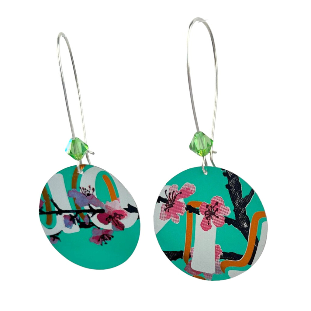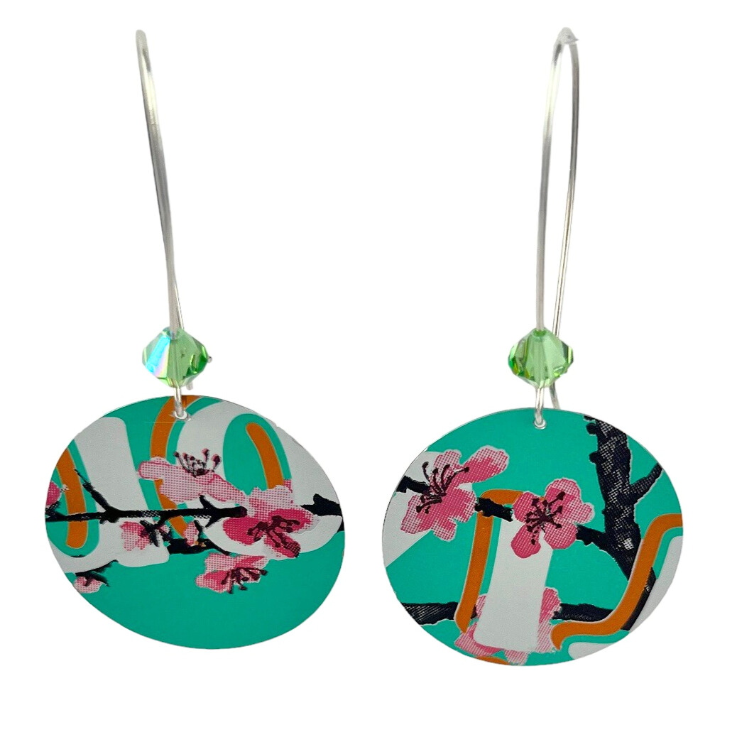 Boucles d’oreilles en canette upcyclée écoresponsable motif Fleur de cerisier version pendantes.