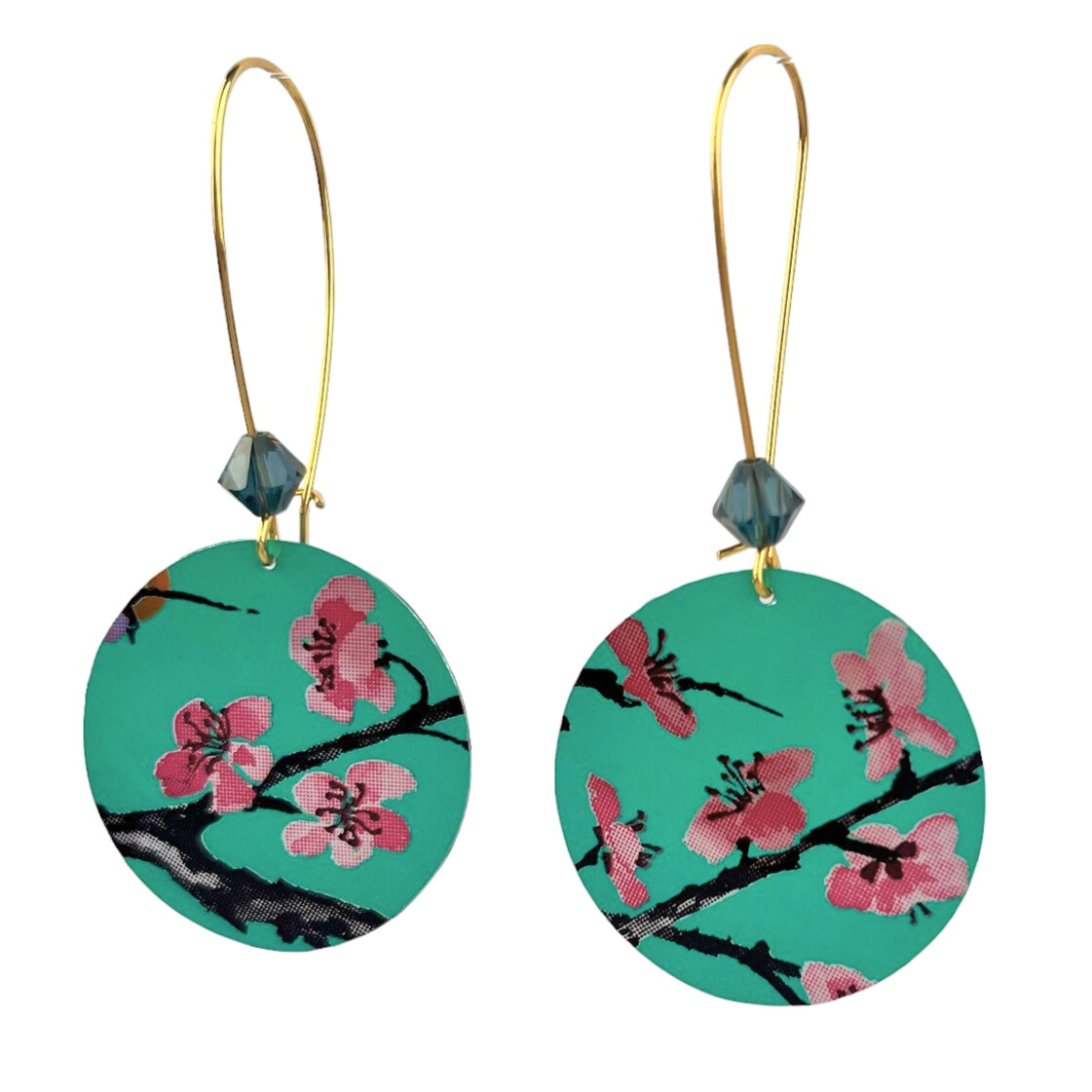Boucles d’oreilles en canette upcyclée écoresponsable motif Fleur de cerisier version pendantes.