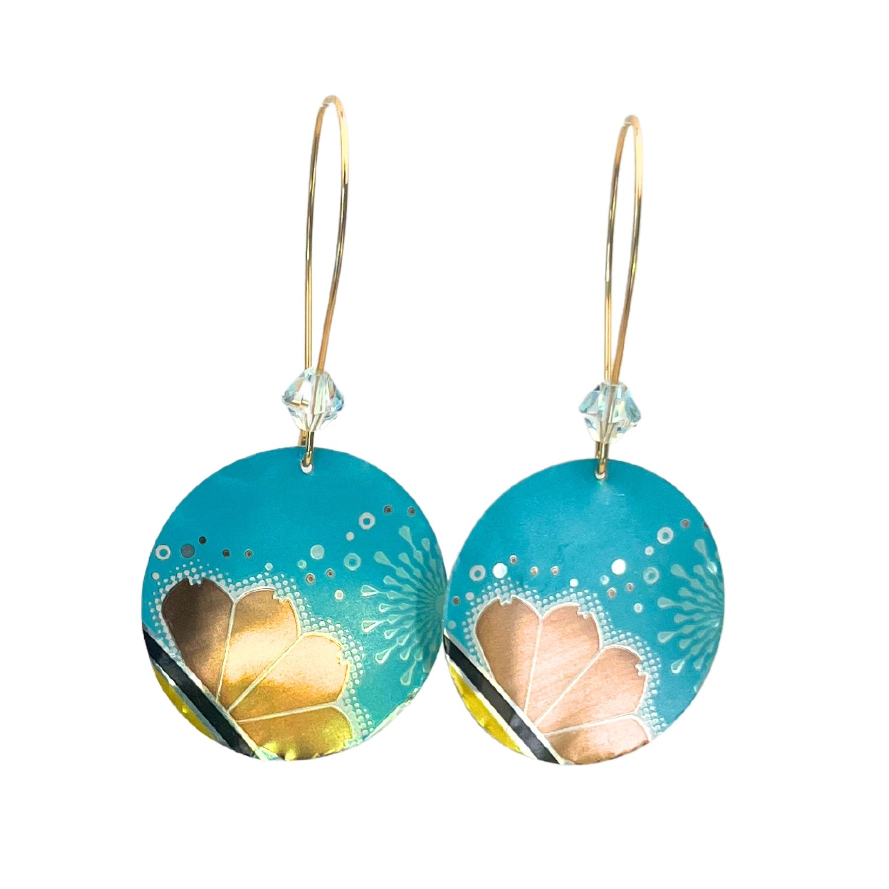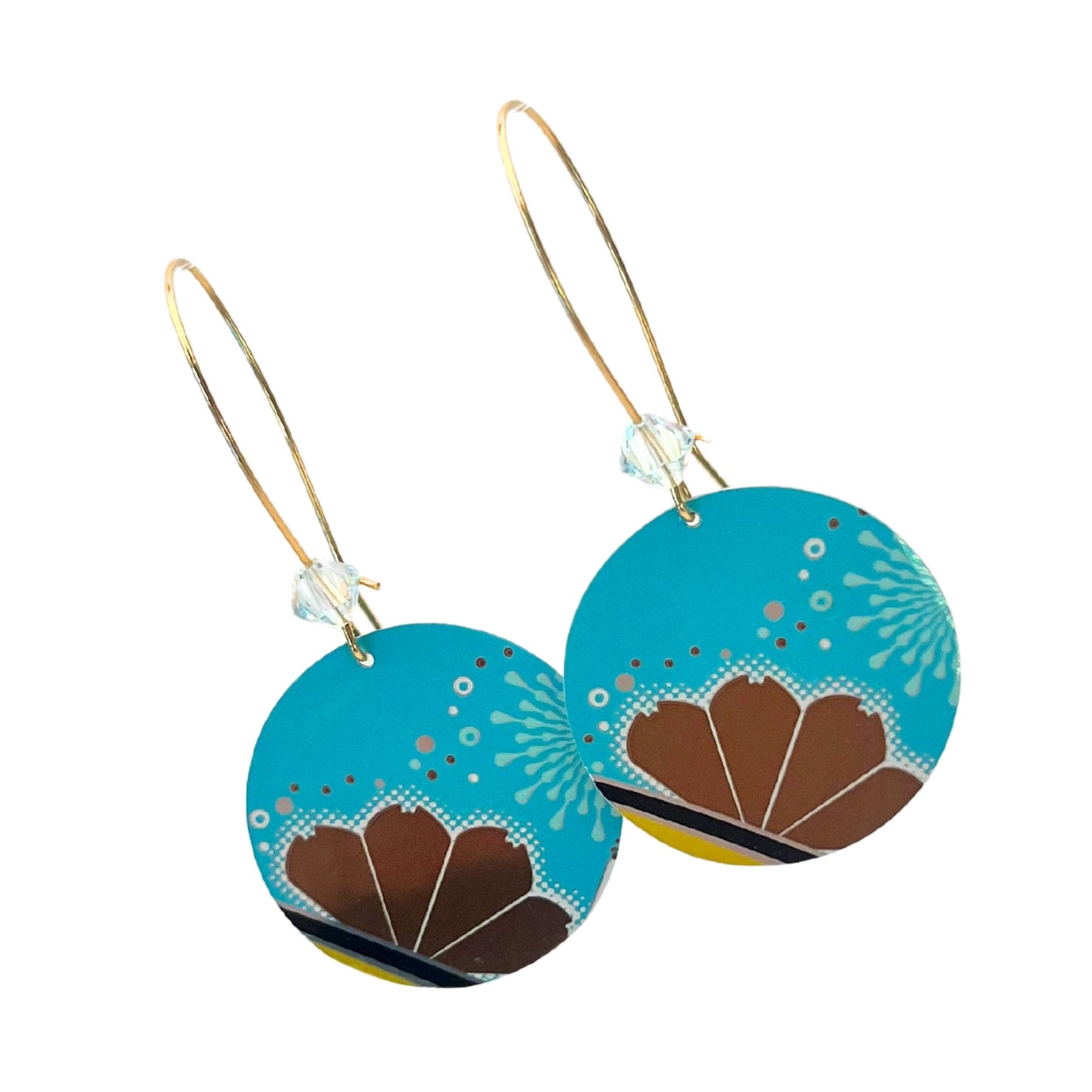 Boucles d’oreilles Lime upcyclée écoresponsable motif floral version pendantes issue d’une cannette de Schweppes.