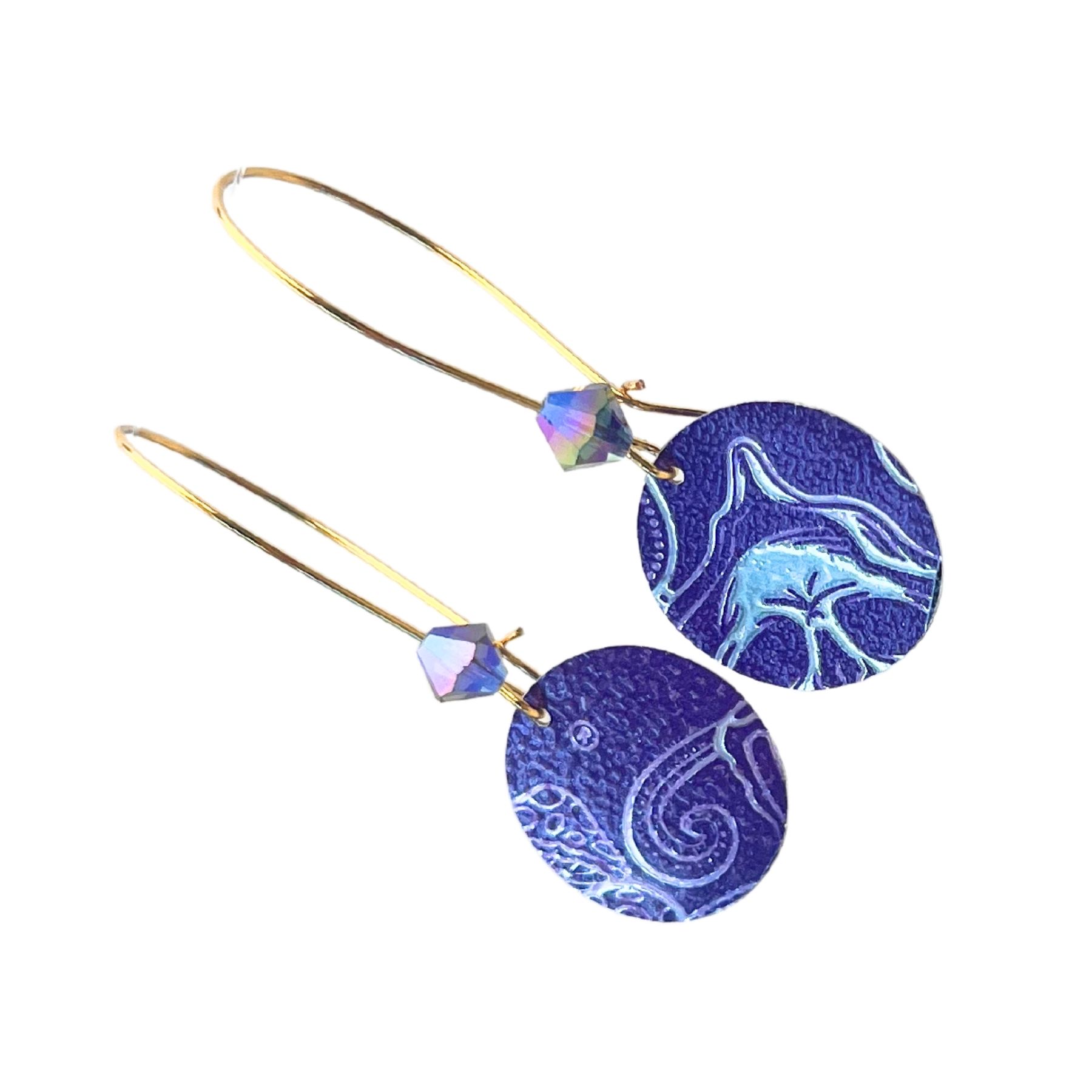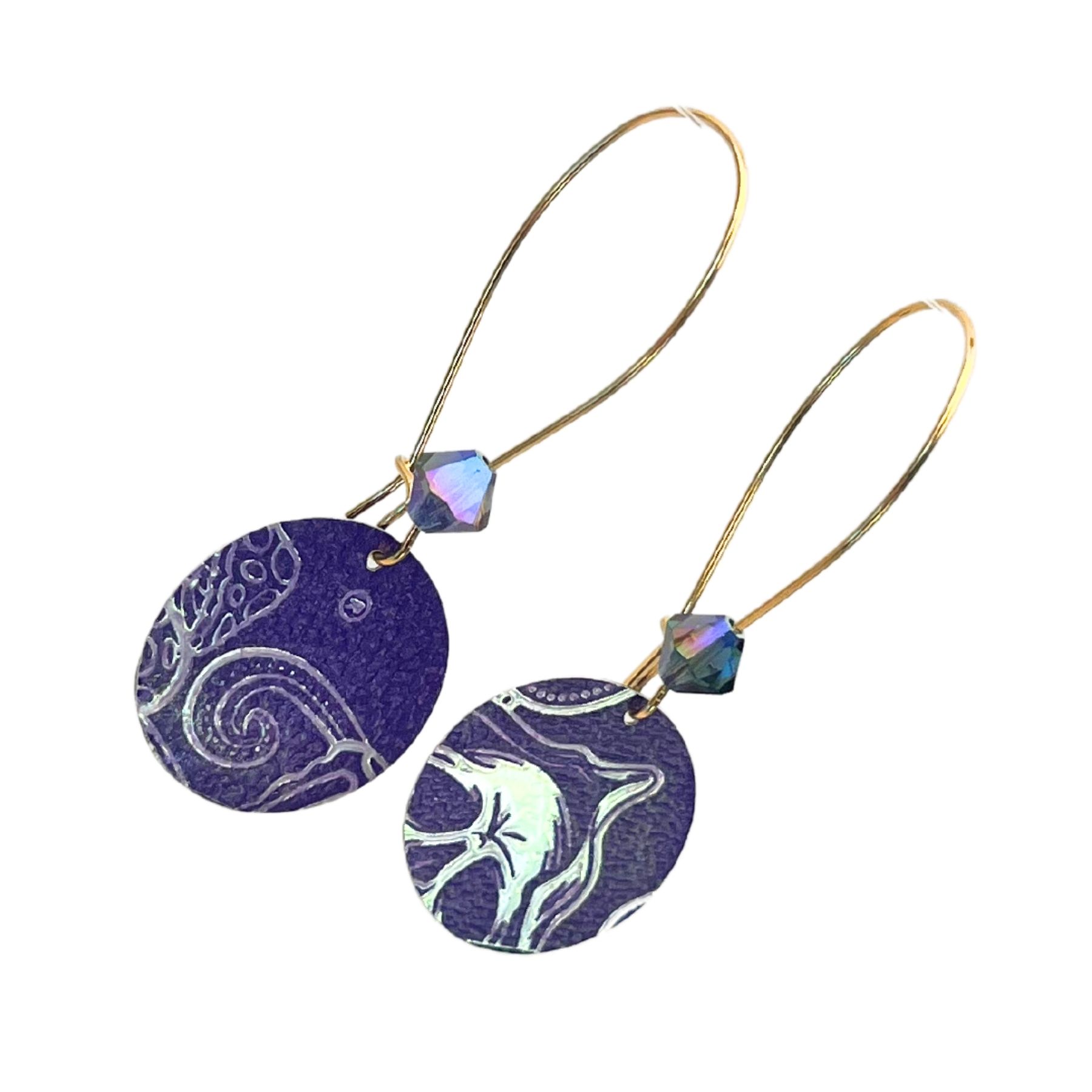 Boucles d’oreilles en canette upcyclée écoresponsable purple version pendantes.