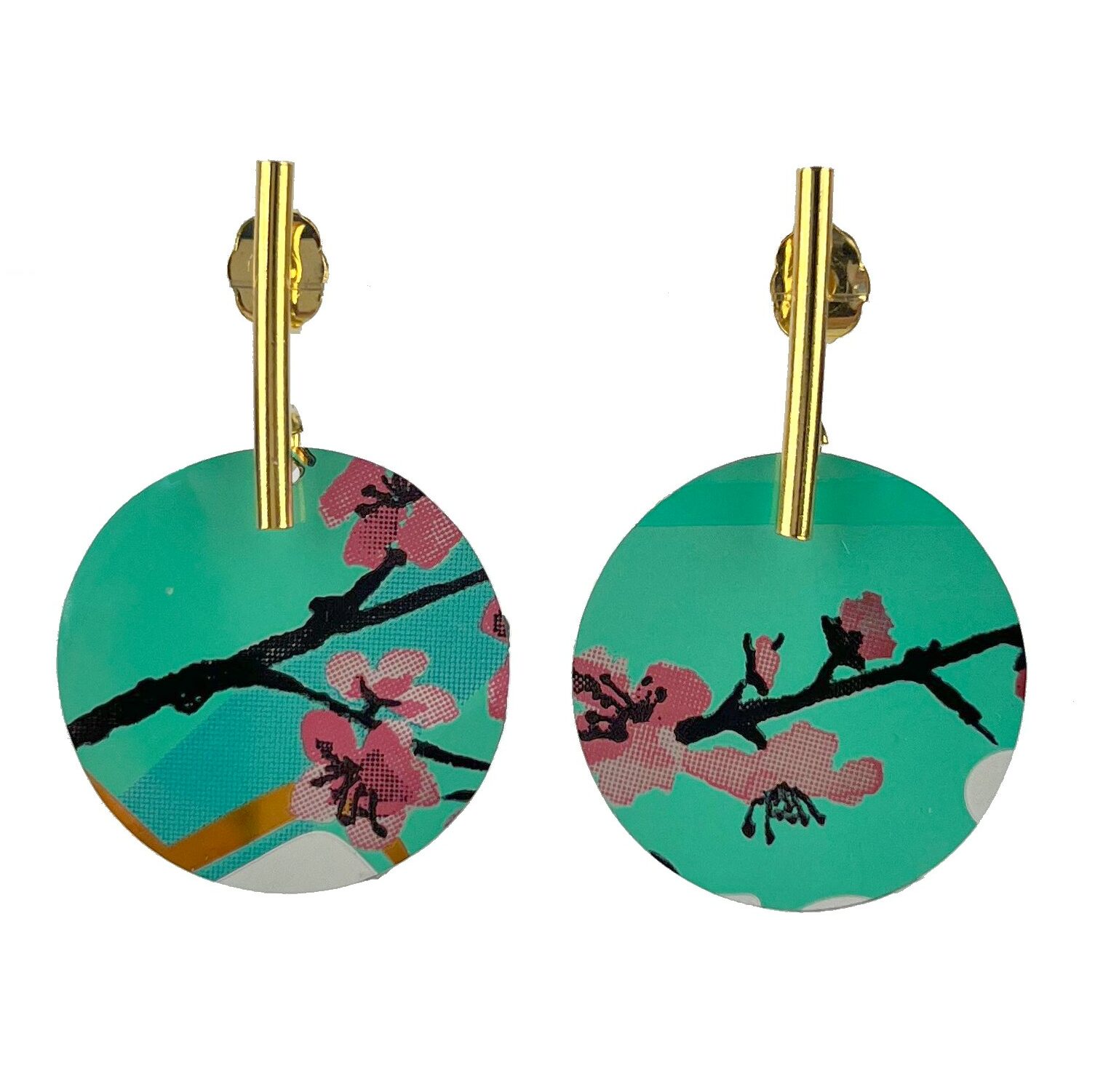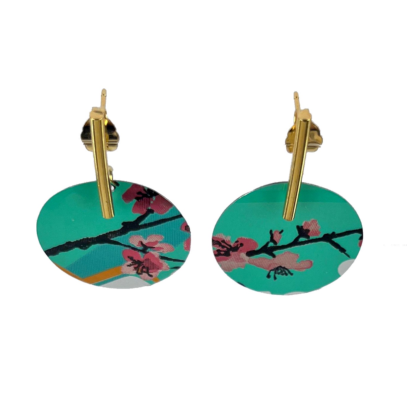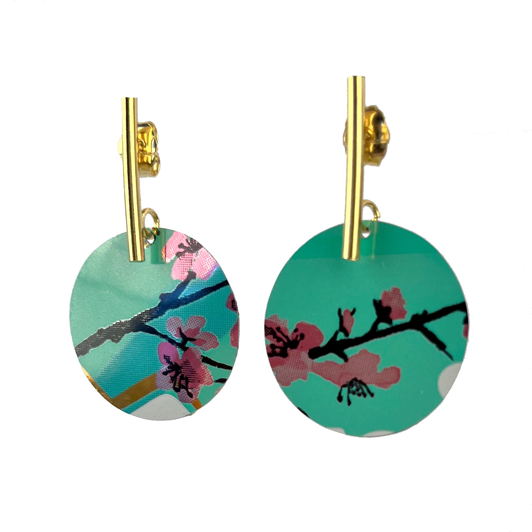 Boucles d’oreilles en canette upcyclée écoresponsable Fleur de cerisier version clous d’oreilles.