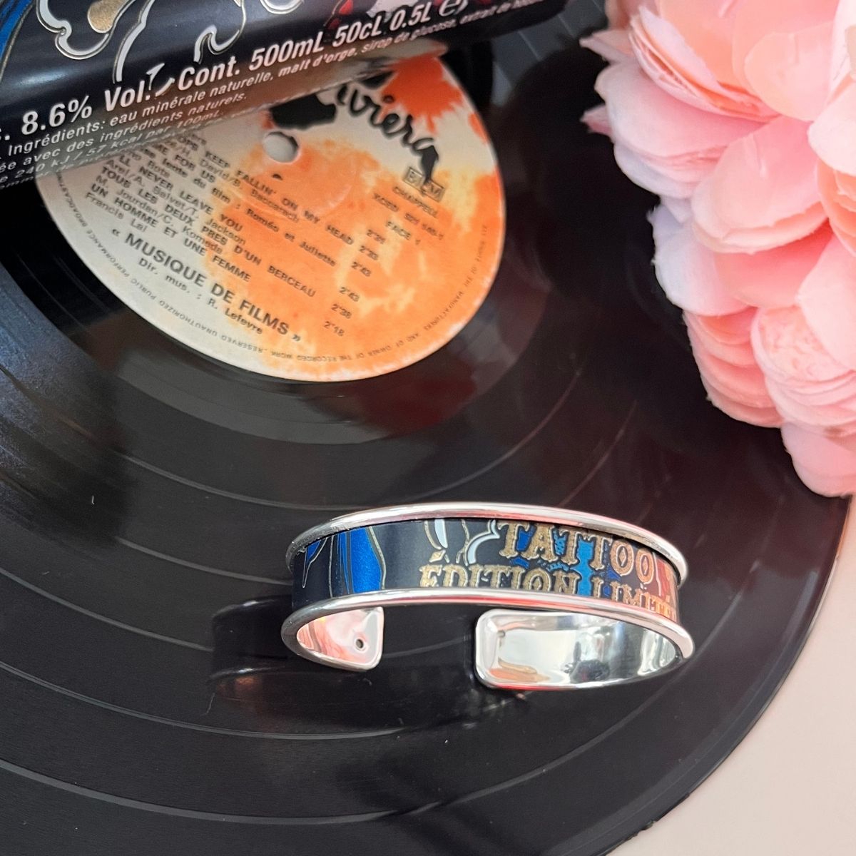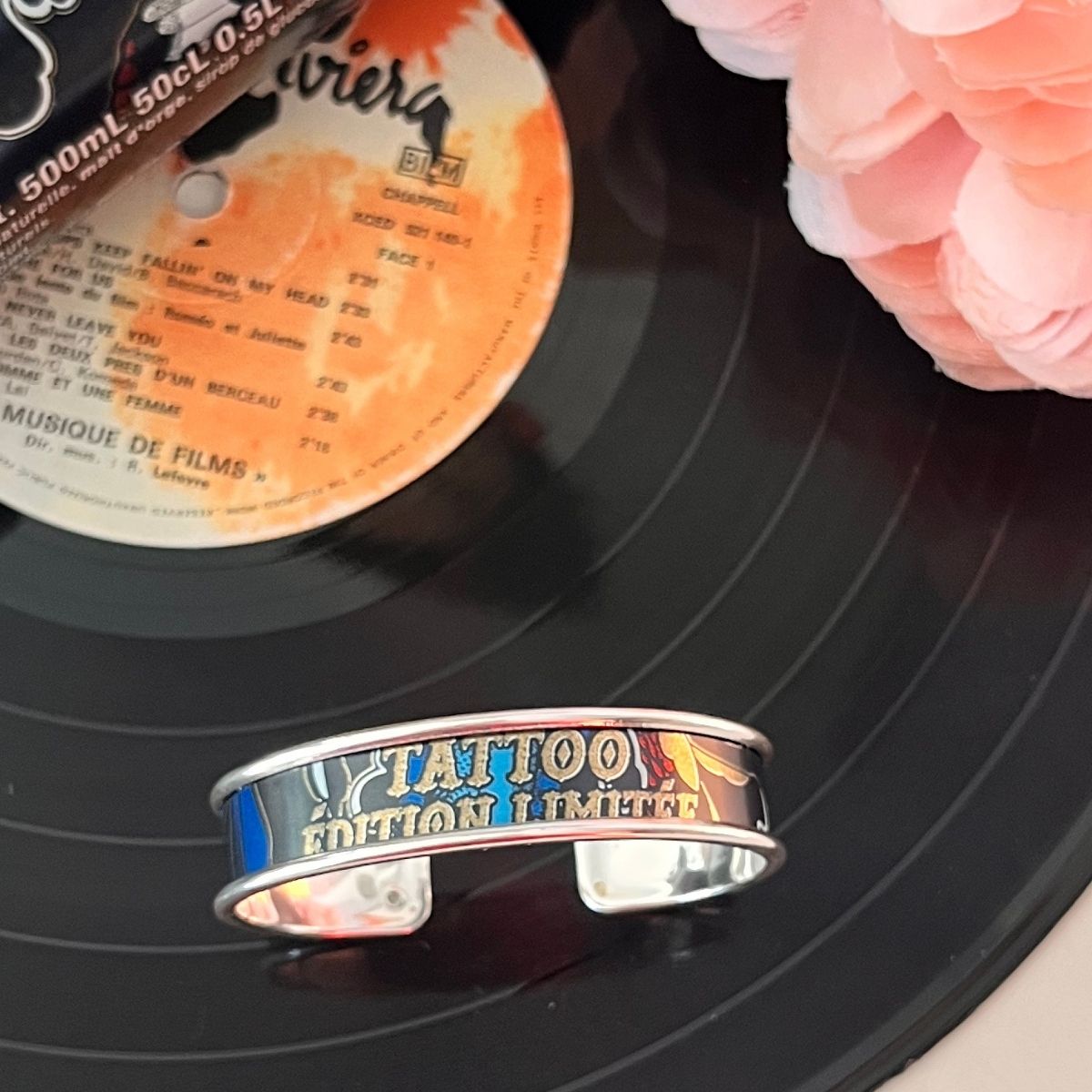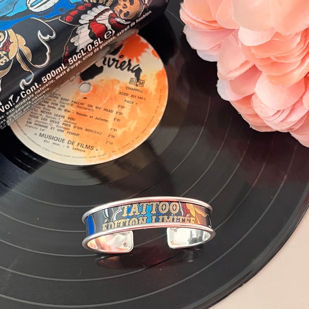 • les manchettes sont ornées d’un morceau de canette upcyclée de la marque 8.6 collector édition Tattoo by Dodie savamment choisi. Une touche d’originalité ajoutée à la beauté d’un design floral et rock. Les boucles ont deux faces pour une finition laser et faire un petit clin d’œil à la marque sur l’envers.