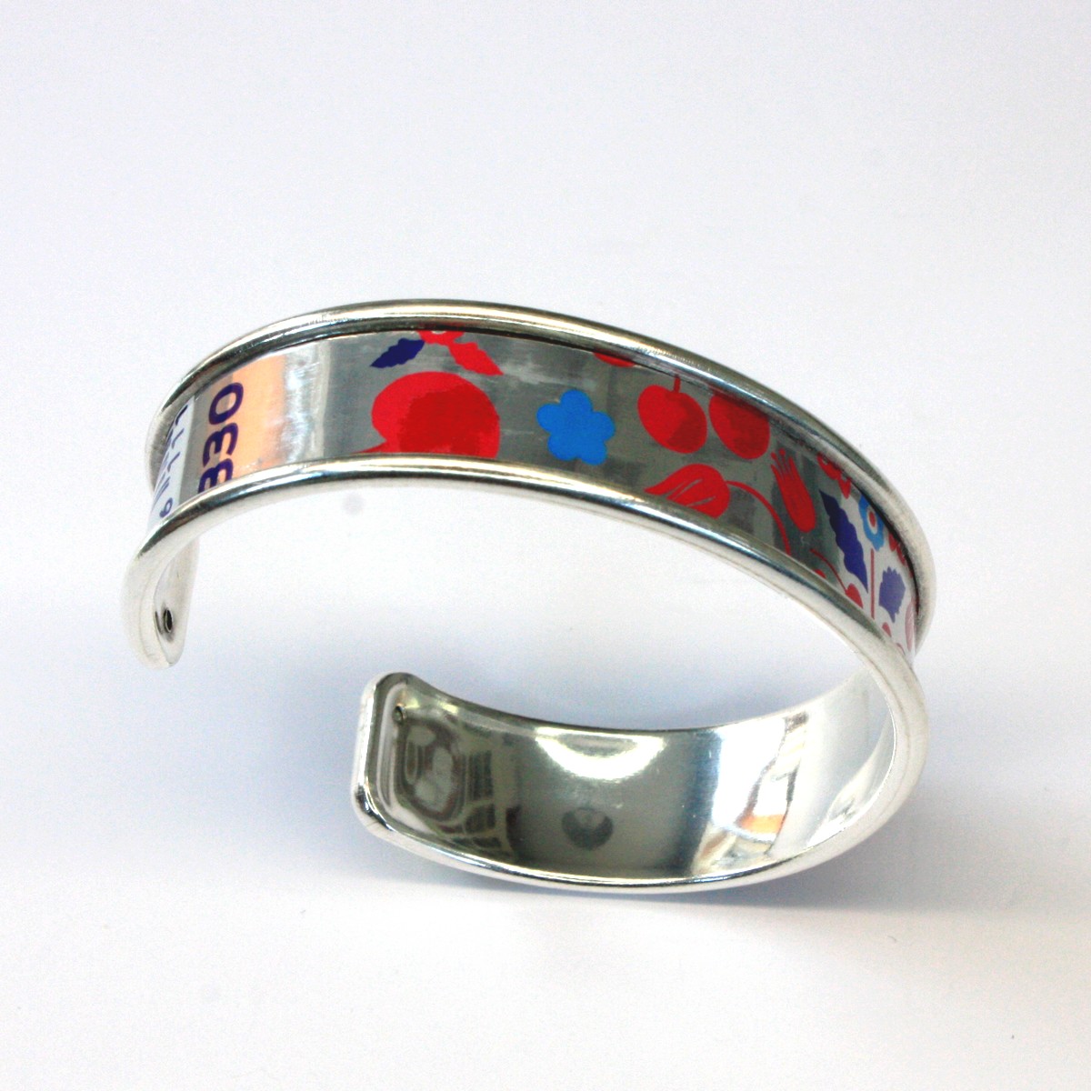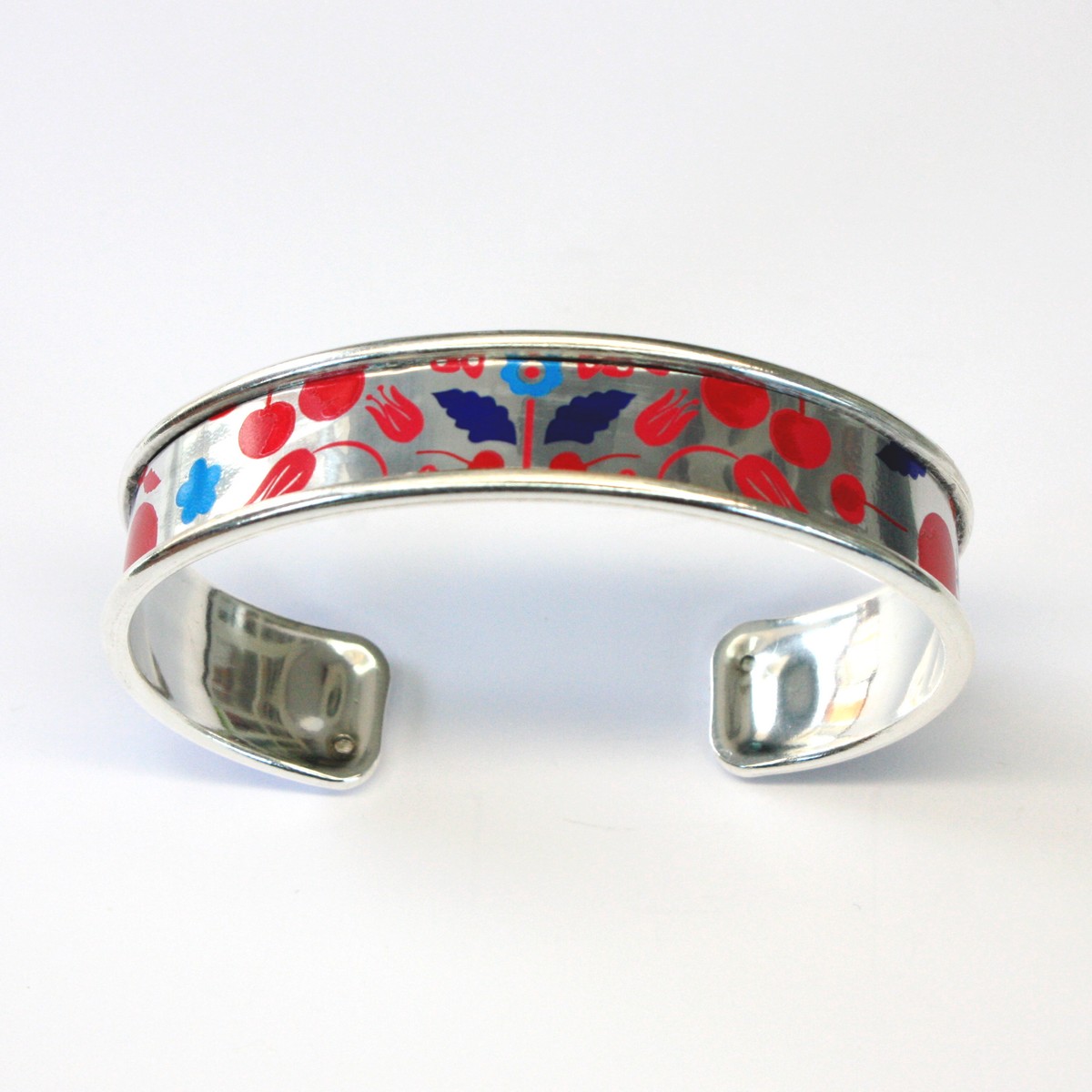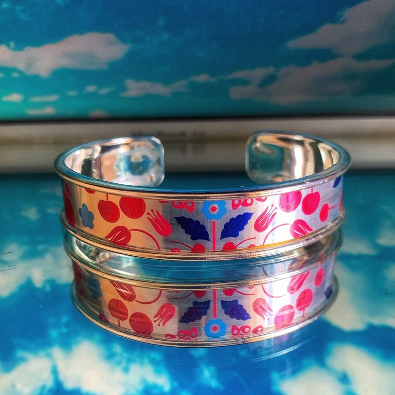 Matières: La manchette Cherry en canette upcyclée est composée d’une canette collée sur un support en laiton recouvert d’une couche d’argent pur ou doré à l’or fin 24 carats suivant la finition choisie, garantit sans allergènes, le support est fabriqué en Europe (Atelier en Grèce et Italie).