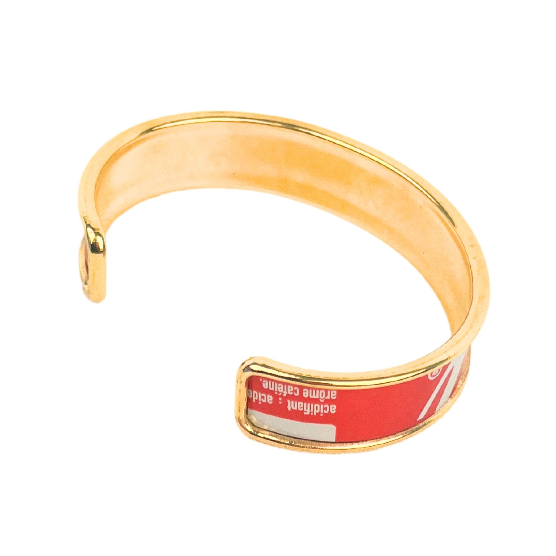 Matières: La manchette cola upcyclée est composée d’une canette collée sur un support en laiton doré à l’or fin 24 carats ou à l’argent pur garantit sans allergènes, le support est fabriqué en Grèce.