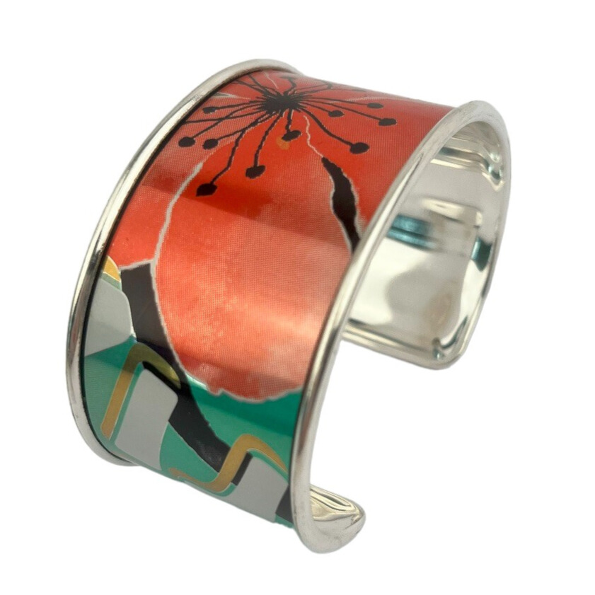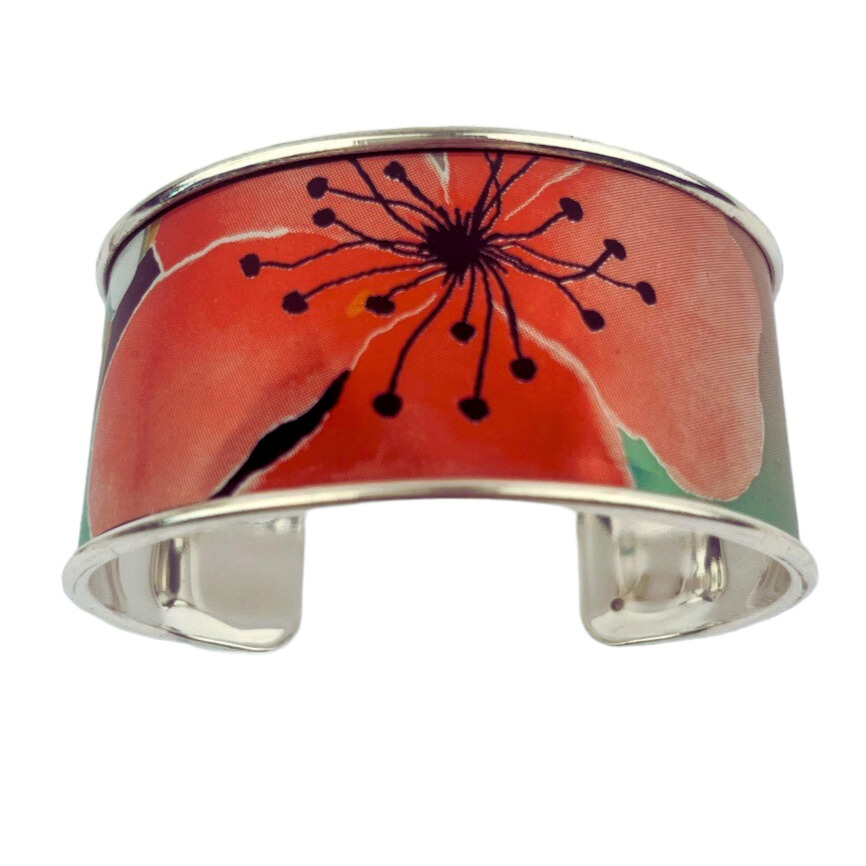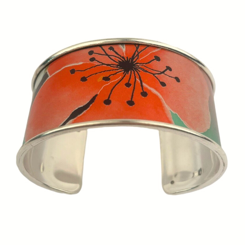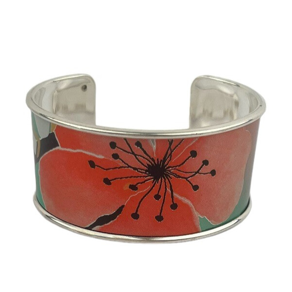 Matières: La manchette fleur de pêcher upcyclée est composée d’une canette collée sur un support en laiton recouvert d’une couche d’or fin 24 carats ou d’argent pur selon la finition choisie et garantit sans allergènes. Le support est fabriqué en Grèce.